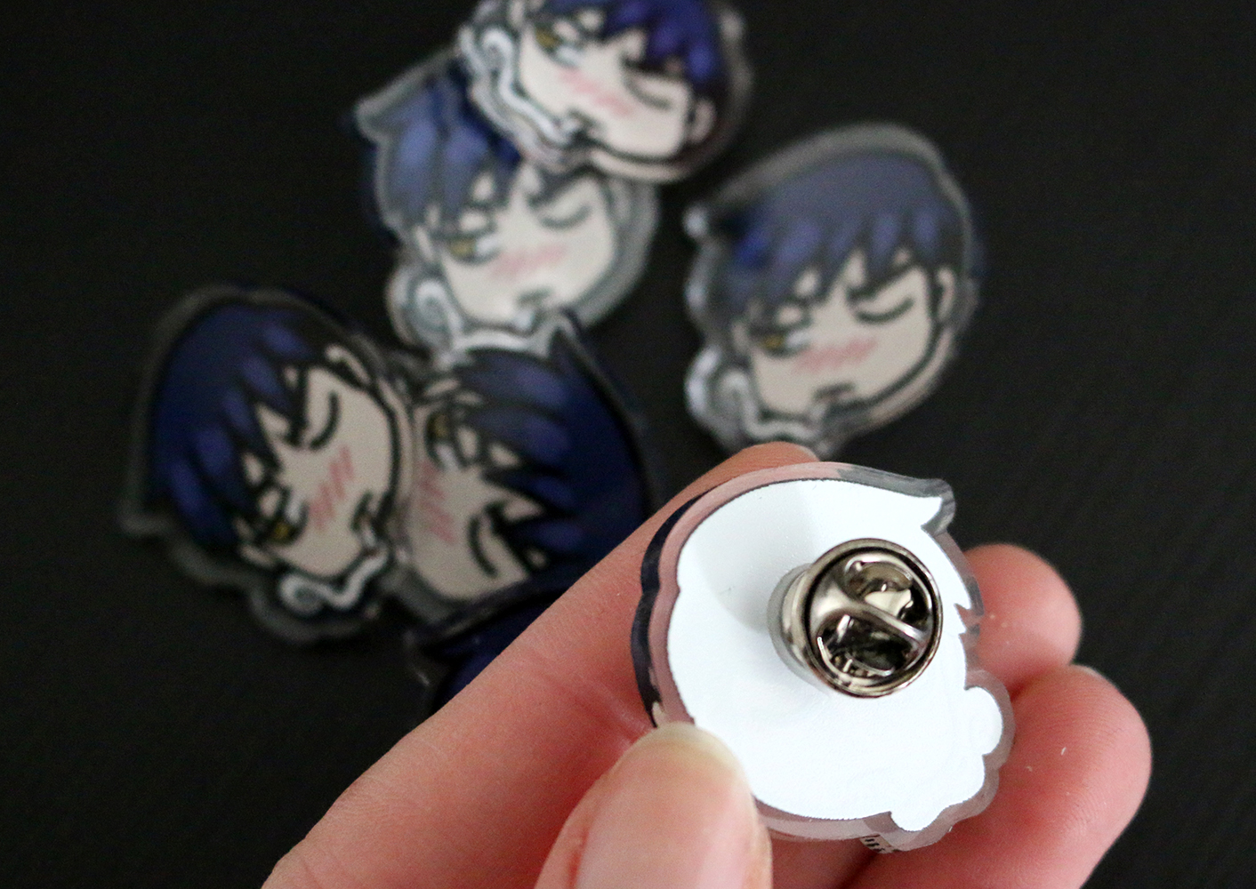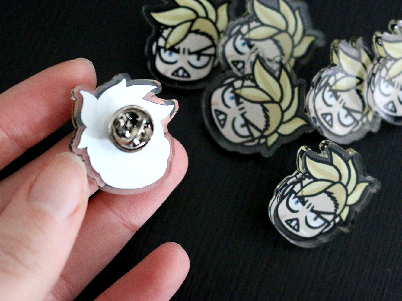 Acrylic pins are 25mm, glossy and come with a backing card and in a small plastic bag to protect from scratches.